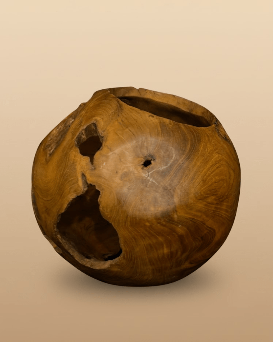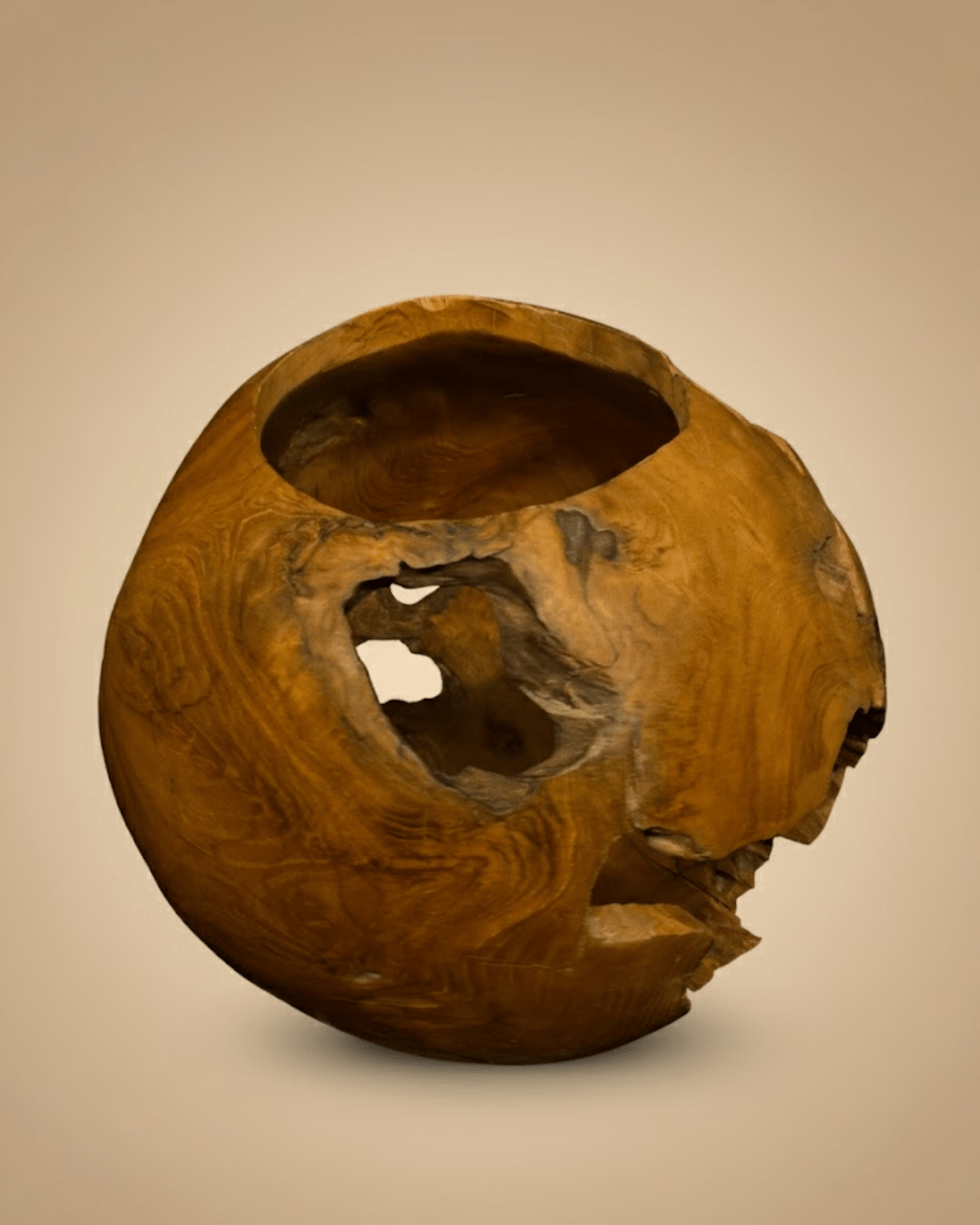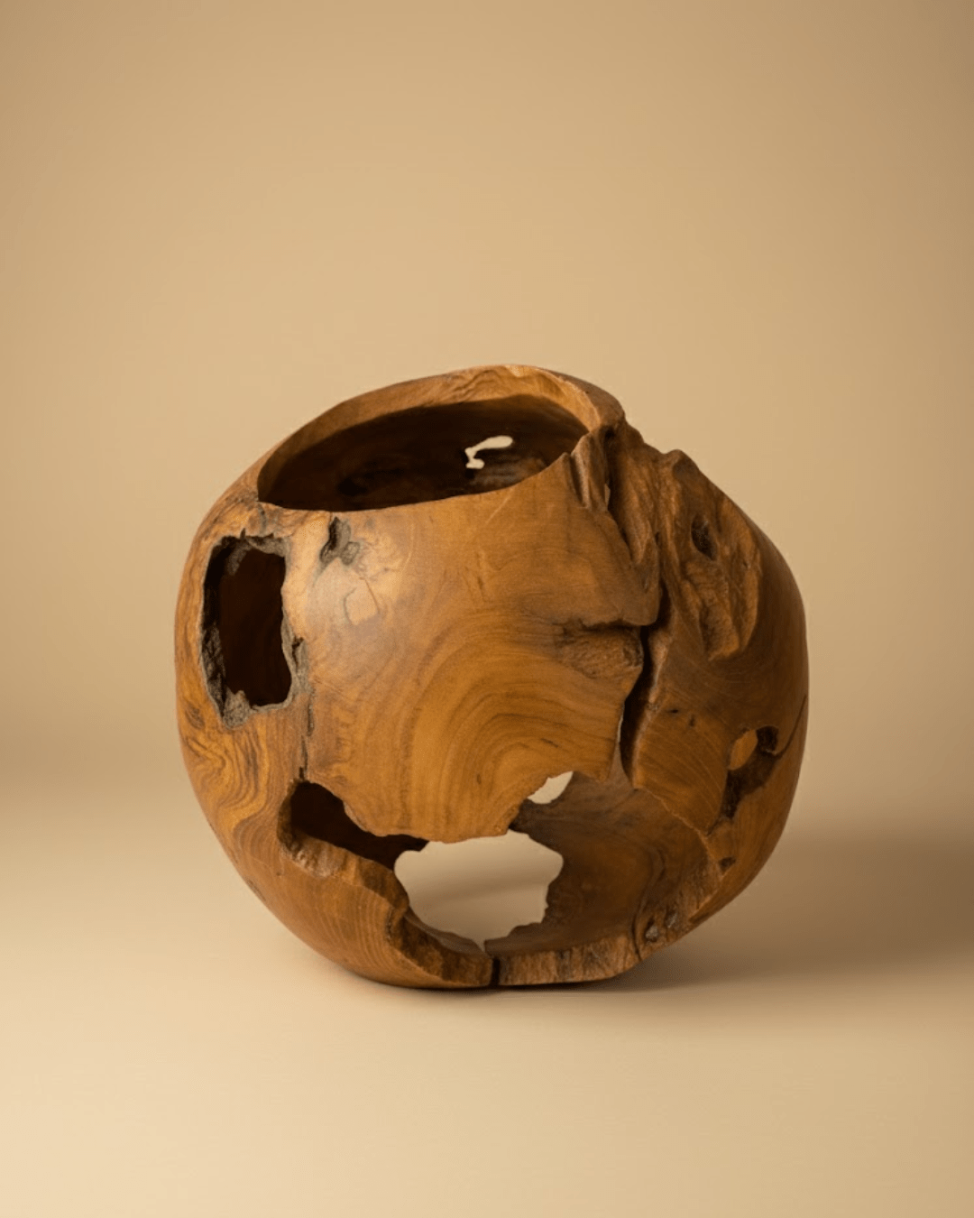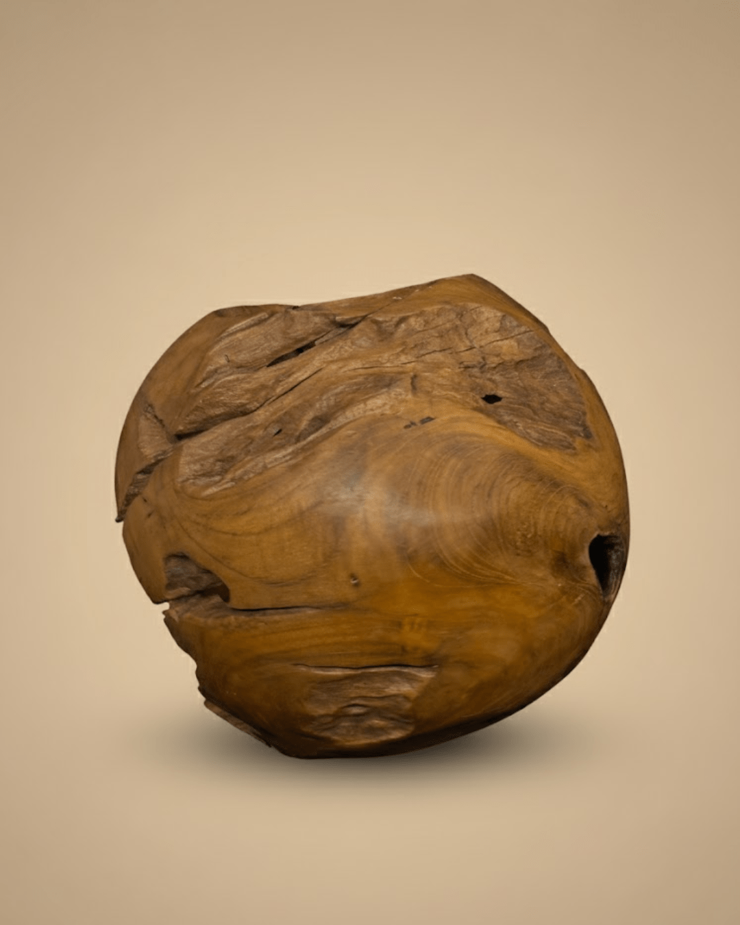 Sculptée dans la masse du teck d’Indonésie, la Déco Boule (AN6) incarne l’essence même de la matière brute sublimée par la main artisanale.